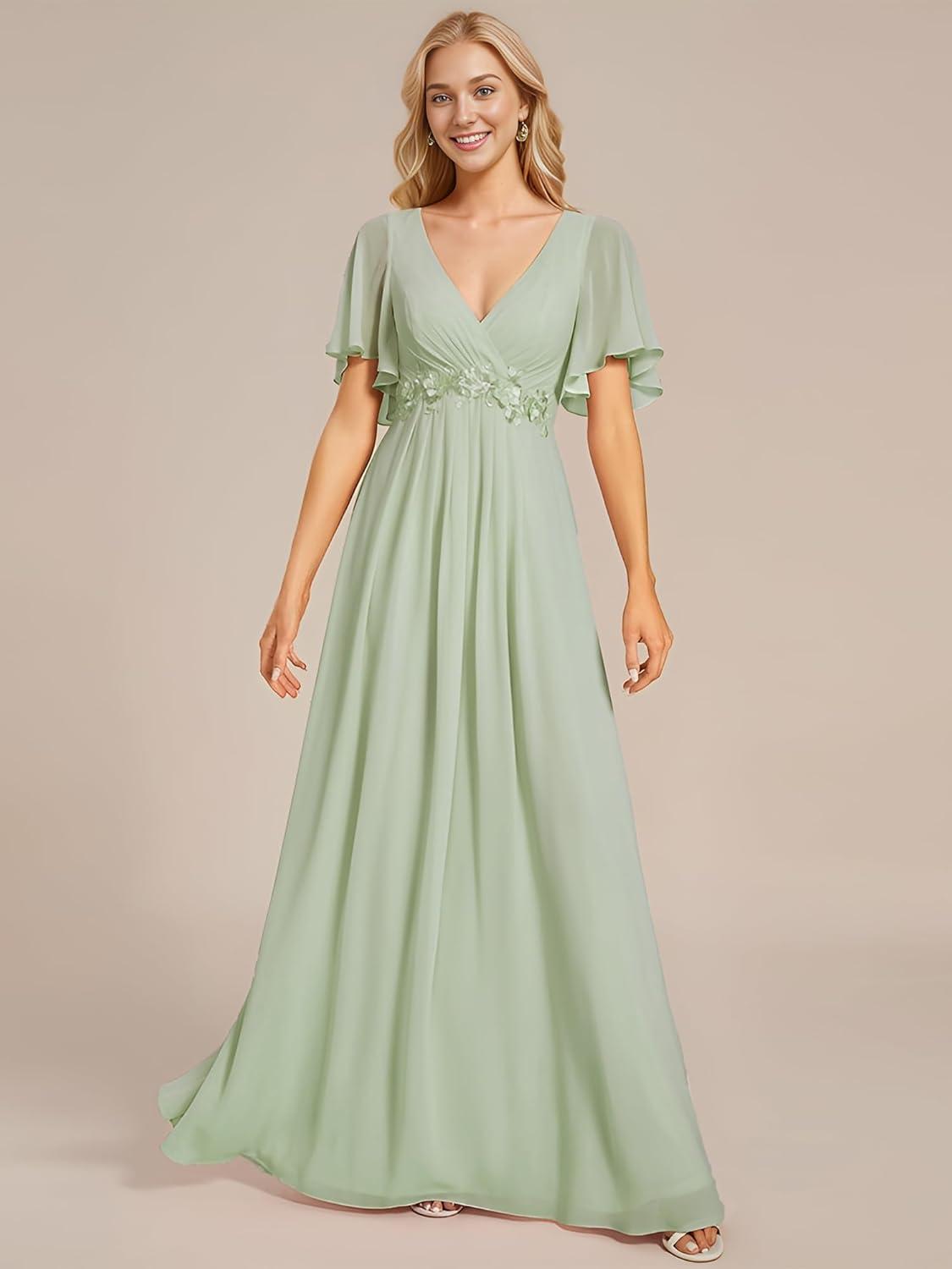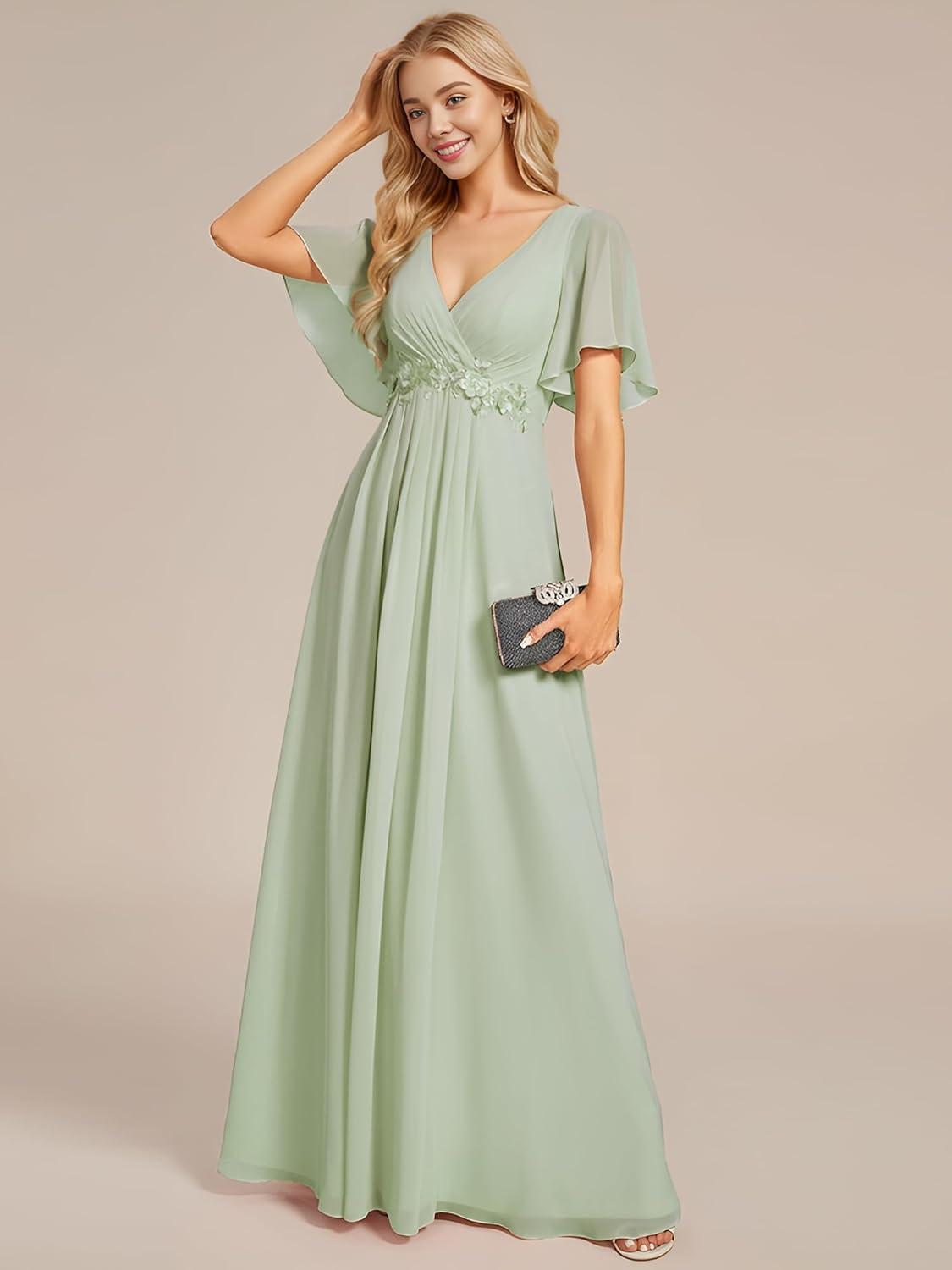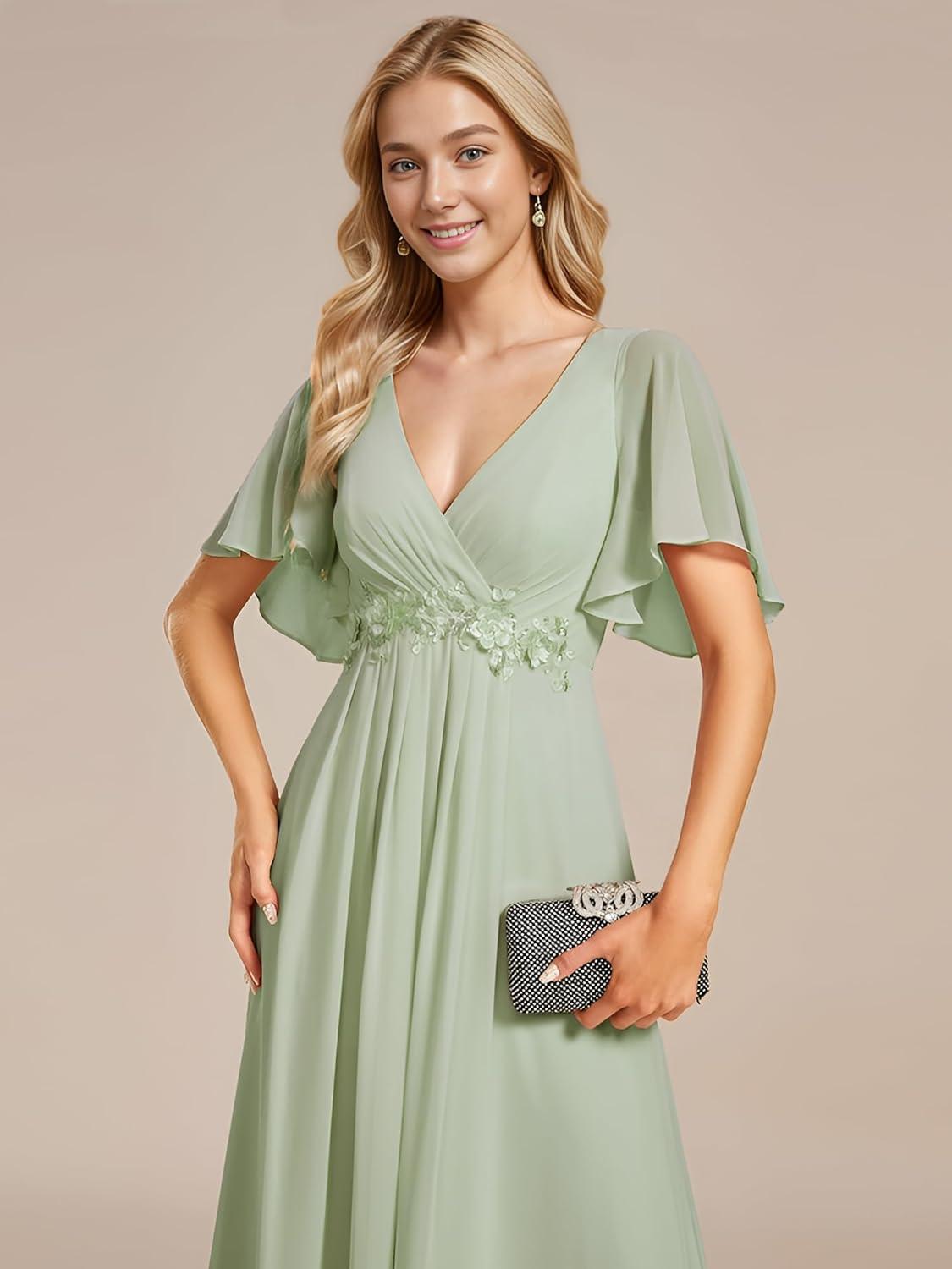 Ever-Pretty Women's V-Neck Flutter Sleeve Long Chiffon A-Line Appliqued Waist Bridesmaid Dress(Mint Green)