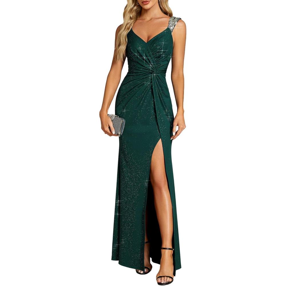Ever-Pretty Women’s V Neck Stretchy Glitter Bodycon Sleeveless High Split Formal Wedding Guest Dresses(Dark Green)